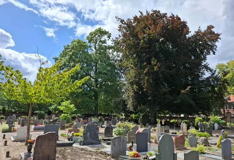 Naast deze vier grote oude bomen zijn er op de begraafplaats nog veel meer bomen. Langs de omringende muur staan zilverlindes. De bladeren zijn aan de onderkant zilverwit, wat een bijzonder effect geeft als de wind er door heen speelt. Deze staan er nu circa 20 jaar. En verder zijn er enkele bijzondere bomen met mooie namen zoals Hemelboom, Zakdoekjesboom, Christusdoorn, Amberboom, Tulpenboom, en een Ginkgo. Vorig jaar hebben we van de gemeente Amersfoort een boom gekregen: een tamme kastanje. Die is uiteraard nog klein, maar een leuke aanvulling op onze verzameling.